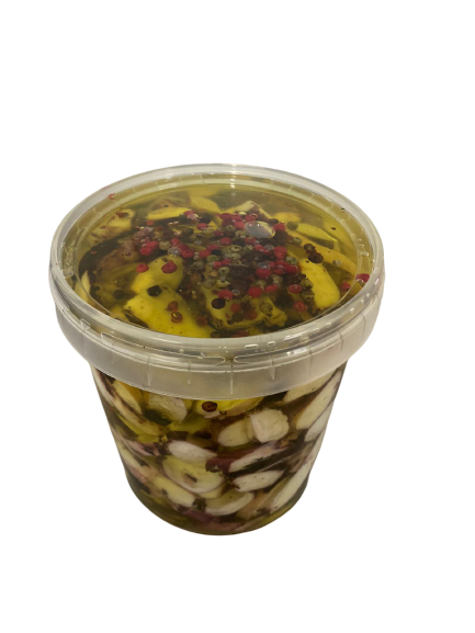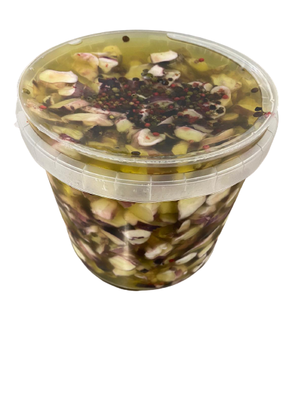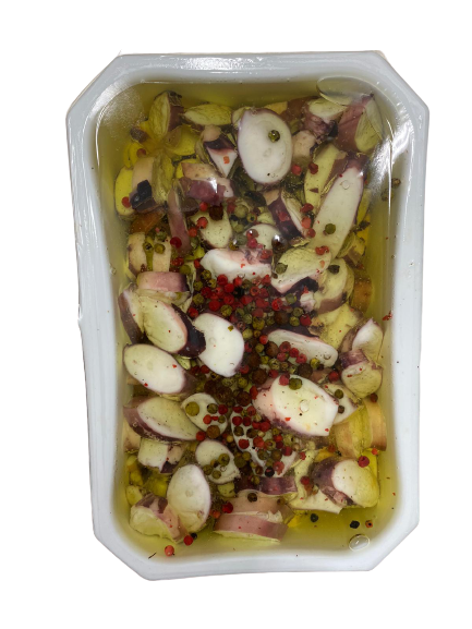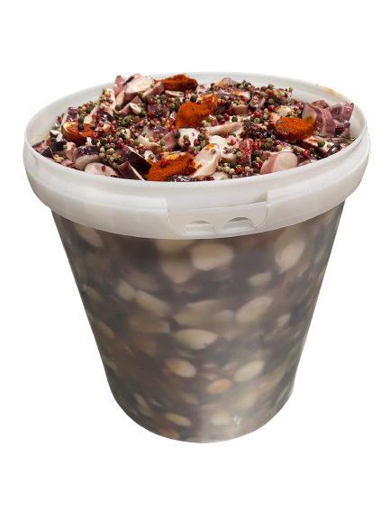 La rodaja de pota cocida a las 5 pimientas se elabora cortando los rejos de pota manualmente y se aderezan con 5 variedades diferentes de pimienta de la mejor calidad.